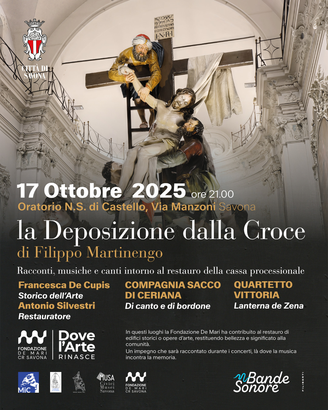 Venerdì 17 ottobre alle ore 21, nell’antico Oratorio di Santa Maria di Castello, verrà presentato il restauro della cassa processionale del venerdì santo “La Deposizione dalla Croce” opera dello scultore Filippo Martinengo detto il ‘Pastelica’ (1793) di proprietà della Confraternita di N.S di Castello e reso possibile dal contributo della Fondazione De Mari CR Savona.